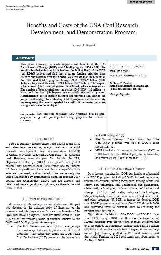 Management Information Services, Inc., “Analyzing and Estimating the Economic and Job Benefits of U.S. Coal,” op. cit.; National Coal Council, “Harnessing Coal’s Carbon Content to Advance the Economy, Environment, and Energy Security,” June 2012; Bezdek and Wendling, “Economic, Environmental, and Job Impacts of Increased Efficiency in Existing Coal-Fired Power Plants,” op. cit.; Southern States Energy Board, American Energy Security: Building a Bridge to Energy Independence and to a Sustainable Energy Future, Norcross, Georgia, July 2006; Roger H. Bezdek, “The Hydrogen Economy and Jobs of the Future,” Renewable Energy and Environmental Sustainability, Vol. 4, No. 1 (2019).