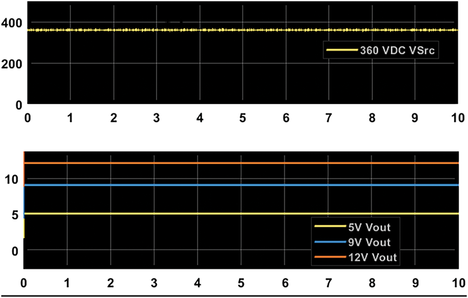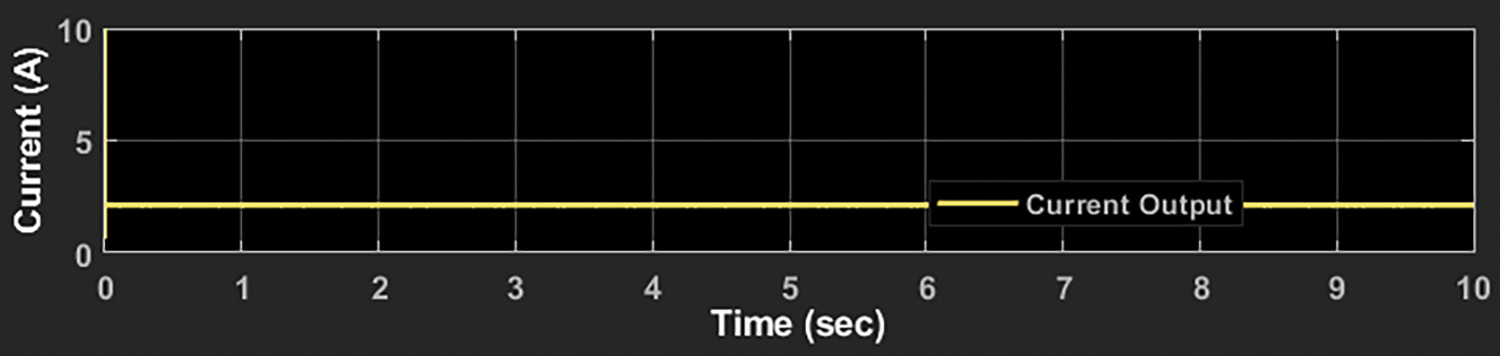 The design of the cellphone charging circuit in Fig. 9 was carried out using MATLAB Simscape. The circuit has 3 similar sections that have different DC regulated outputs (5 V, 9 V, 12 V) which is used for cellphone charging. The Zener diode in each section of the circuit design produces a stable reference output voltage of 3.2 V, which is used to compare the feedback voltage from the voltage divider setup. The voltage divider setup of the circuit (R2, R3, R5, R6, R8, R9) feeds a fraction of the output voltage to the input of the Operational Amplifier. The feedback voltage is them compared with the reference voltage (3.2 V) from the Zener diode, the difference of the comparison is augmented by the OP Amp and is used to control the base current of the NPN transistor. The increase in the conduction of the base current of the NPN transistor drives more current to flow from the 360 VDC to the load which is the battery of the mobile phone to be charged. In other hand, if the conduction current of the base current decreases, the NPN transistor will restrict current from flowing from the 360 VDC. The Operational Amp and the NPN transistor in the circuit work together to regulate the output voltage to maintain a stable output. The graph below shows the result of the stimulated charging circuit. In Fig. 10A, the source of the circuit is 360 VDC which is stepped down to a regulated output steady Direct voltages that is used for charging cellphones, the output voltages as can be seen in Fig. 10B are 5 V, 9 V and 12 V. Fig. 11 shows the output current of the stimulated circuit, the output current of 2 A is the same across the three voltage output.