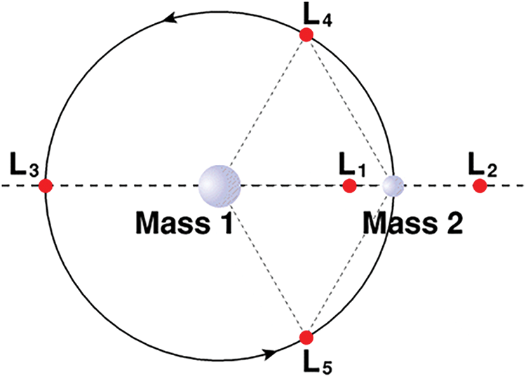 Fig. 1. Diagram displaying Lagrange points–L2 is where a solar satellite could be stationed to provide solar power at night.