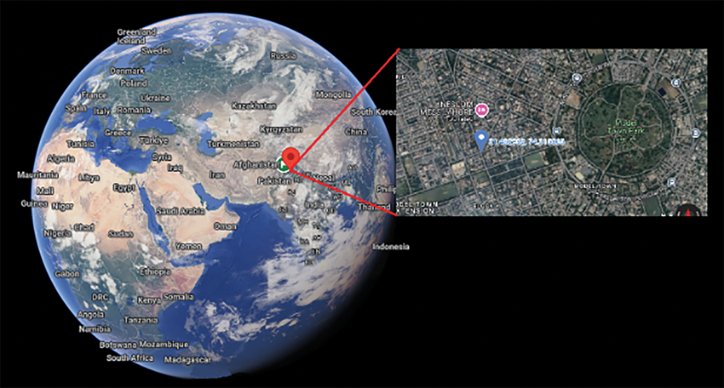 The location of the study is a building in Lahore, Pakistan. The city of Lahore is the second most heavily populated one in the country. It is a metropolitan division and its population is around 22 million [27]. The coordinates of the place are 74.3156 degrees of latitude and 31.482982 degrees of longitude. These numbers indicate that the location is in the vicinity of Fig. 1, which is a screenshot of the site taken from Google Maps.