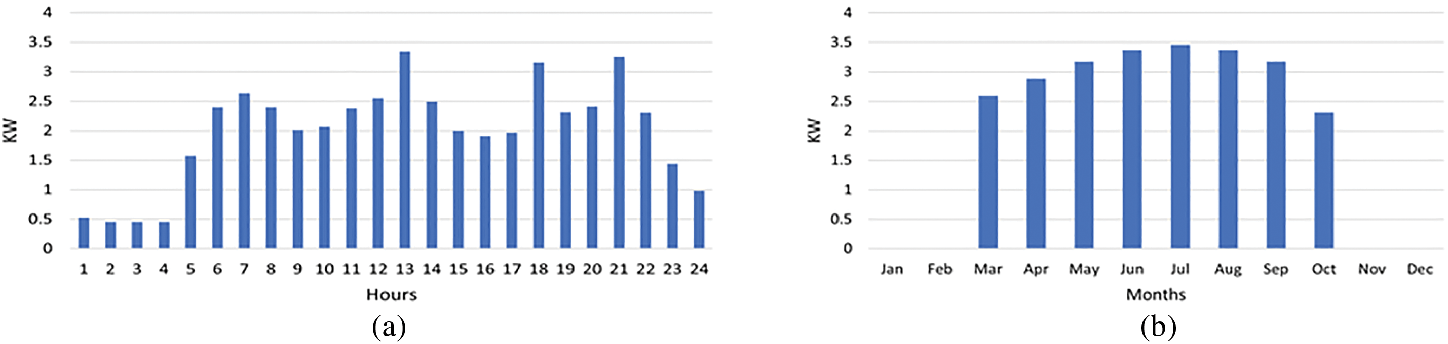Fig. 2 shows the typical electric load diagram of the house. In the summer months in Pakistan, the temperatures can be as high as 45°C. Therefore, the air conditioning systems are used to create comfortable indoor conditions. It is seen from the past energy consumption records that the family consumes an average daily electricity of 25.06 kWh, with a significant rise during the summer period. The maximum electricity consumed by the house is about 7.0 kW. It is the sum of the two loads, one house load and the other the AC load (Deferrable load), which are usually used in summer.