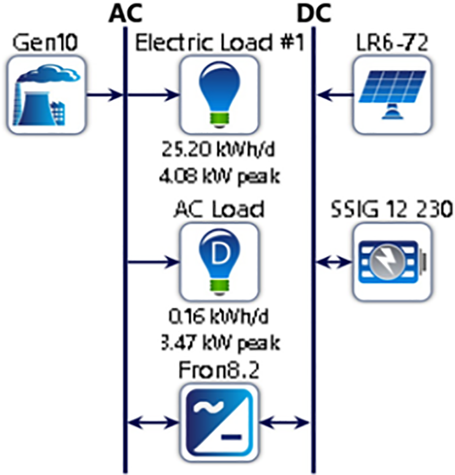 This microgrid requires 25 kWh/day and has a peak of 3.349 kW. In the proposed system, the following generation sources serve the electrical load as shown in Fig 4.