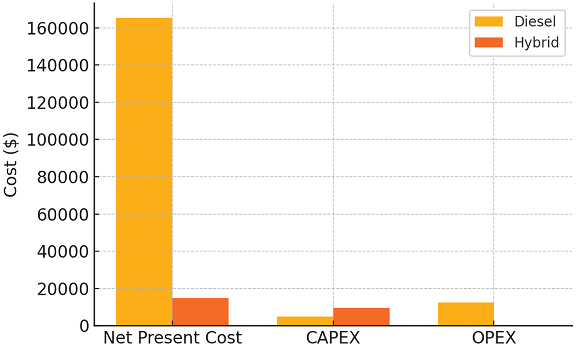 The Net Present Cost (NPC) of the hybrid system was estimated at $14,713 compared to $165,157 for the diesel-based system, reflecting a 91% cost reduction over the system's 25-year lifetime (Fig. 5). The Levelized Cost of Energy (LCOE) dropped from $1.38/kWh (diesel) to $0.123/kWh (hybrid). The capital cost increased from $4867 to $9534 but was offset by annual operating cost savings of over $11,998. The investment yielded an Internal Rate of Return (IRR) of 228% with a simple payback period of just 0.491 years as shown in Table VIII.