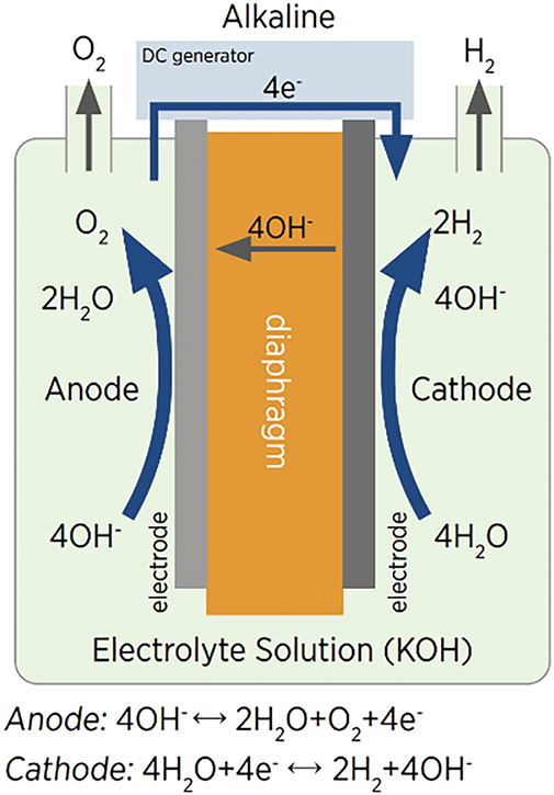 An alkaline electrolyzer cell has an anode and a cathode, usually made of nickel and a catalytic coating. The electrodes are separated by a diaphragm, as shown in Fig. 1. The diaphragm is usually a material called Zirfon Perl, which is composed of zirconium dioxide and polysulfone [5]. An aqueous electrolyte solution of potassium or sodium hydroxide flows to both electrodes [11]. The electrode reactions are presented in (1) and (2) [3], [11]. The charge carrier in AWE is OH− as seen from the reactions [3]: