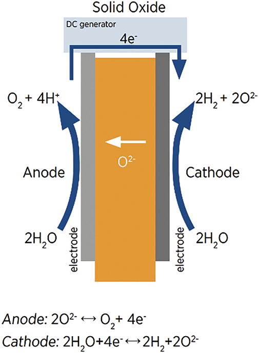 An SOEC has a solid membrane through which ions move from the cathode to the anode [3]. In SOEC, O2− acts as the charge carrier. The electrode reactions are presented in (5) and (6) [3]. A diagram of an SOEC is shown in Fig. 3.