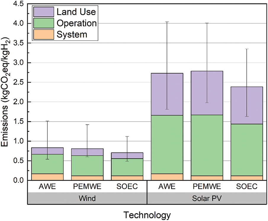 Zhang et al. [19] found that an SOEC electrolyzer causes emissions of 0.211 kgCO2eq/kgH2, when producing hydrogen coupled with onshore wind. Of these emissions, the hydrogen production system is responsible for 12%, that is, 0.025 kgCO2eq/kgH2. Wei et al. [20] conducted a comparative LCA of hydrogen production technologies and found the SOEC system equipment causes emissions of 0.00162 kgCO2eq/MJH2 (0.19 kgCO2eq/kgH2, LHV basis). The LCA conducted by Iyer et al. [21] reached system emissions of 0.045 kgCO2eq/kgH2 produced by an SOEC.