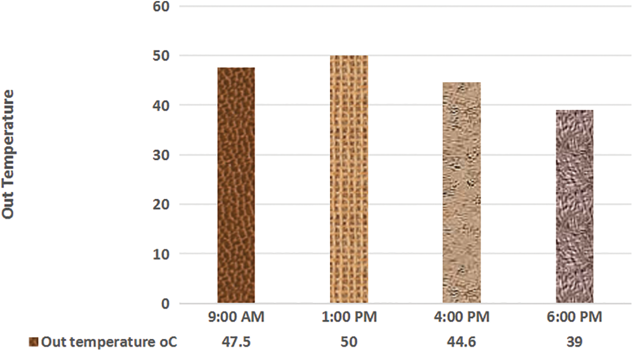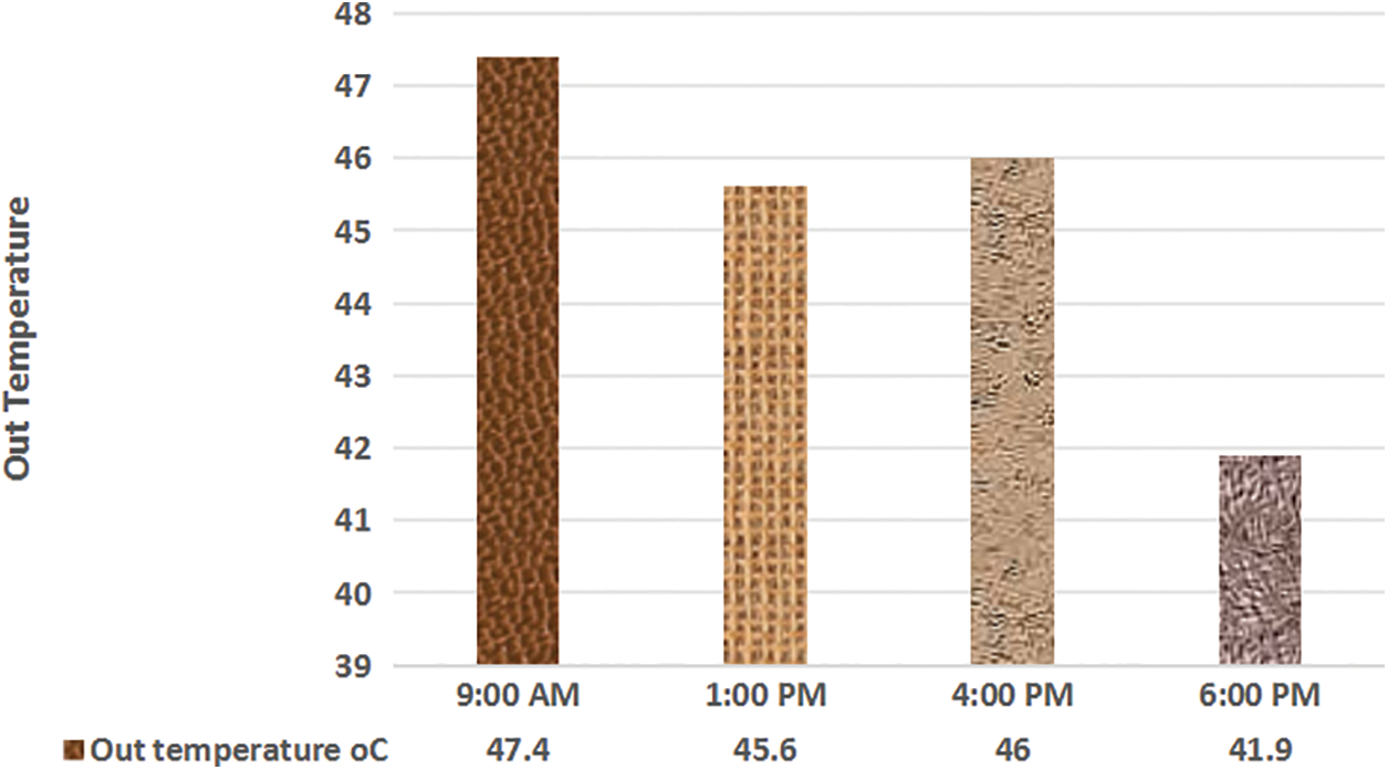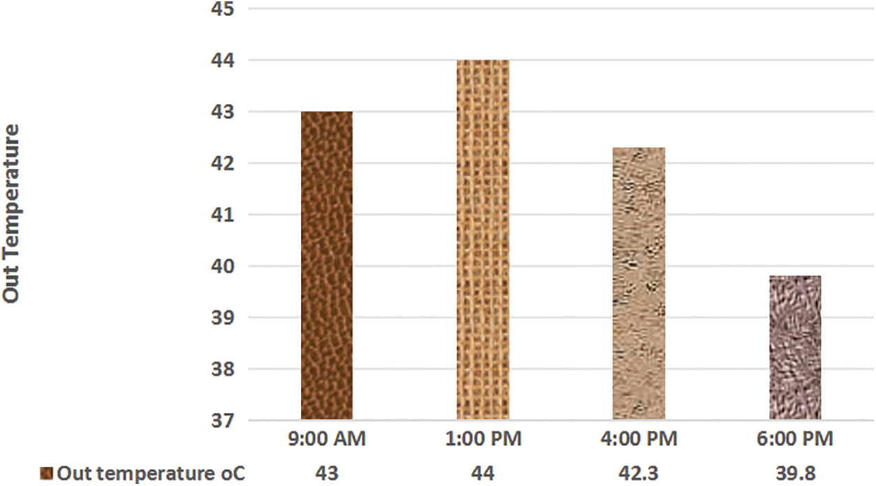 The out temperature at different times of the second day shown in Table IV consequently the change in temperature can be determined as shown in Fig. 16 and Fig.17. showed the thermal, flow (J) of the fourth day shown.