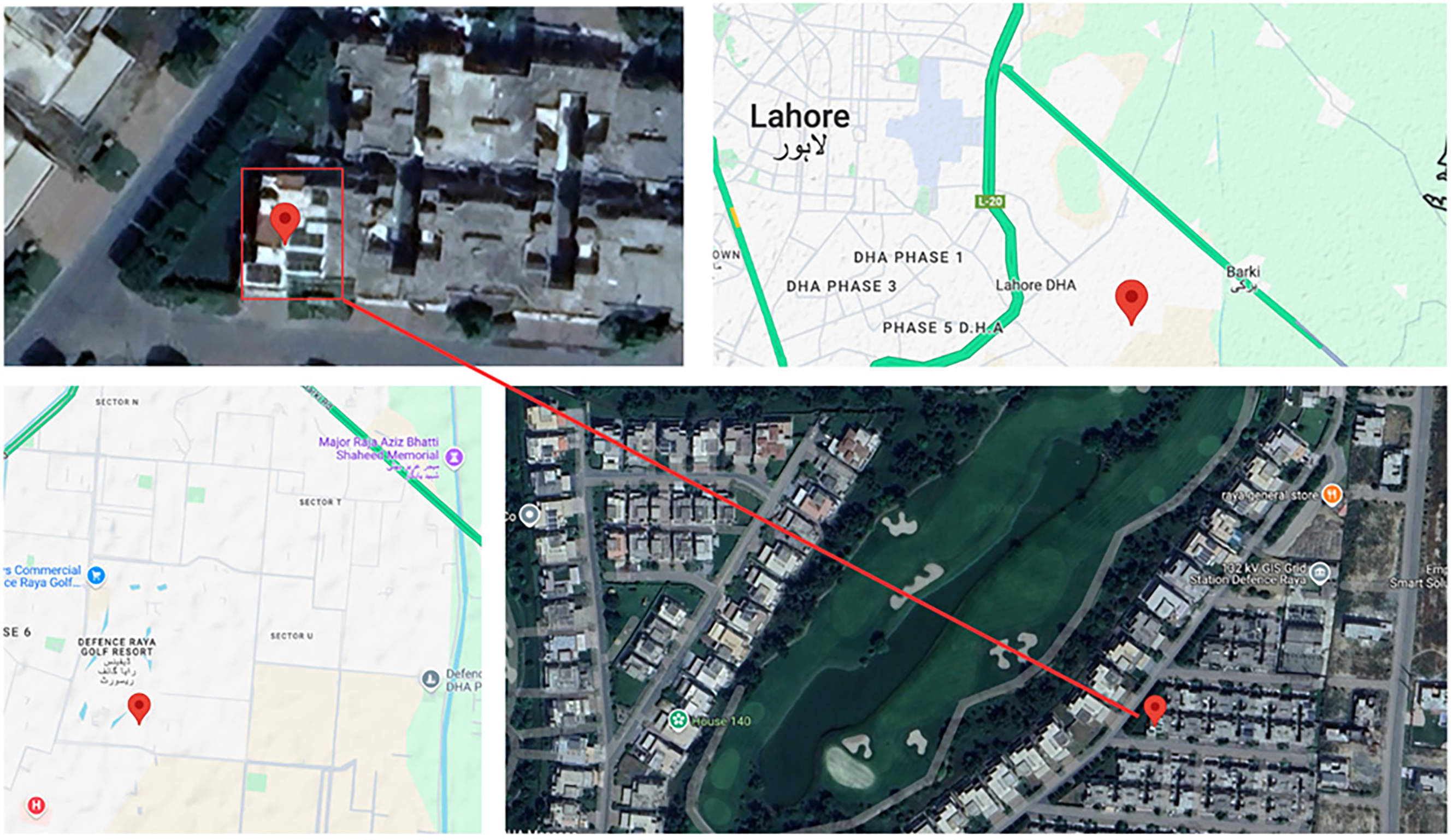 The photovoltaic (PV) system is installed in a residential property located in the Defense Housing Authority (DHA) area of Lahore, Pakistan. The geographical coordinates of the site are 31°27′49.0″N latitude and 74°28′25.7″E longitude, as illustrated in the satellite image (Fig. 1). This region benefits from abundant solar energy due to its geographical positioning, making it ideal for implementing rooftop solar PV systems. The site offers ample roof space and favorable solar insolation throughout the year, which enhances the efficiency and productivity of the installed PV system. The PV setup, with a capacity of 7.5 kVA, integrates grid-tied technology to supply electricity to the house and export surplus energy back to the grid.