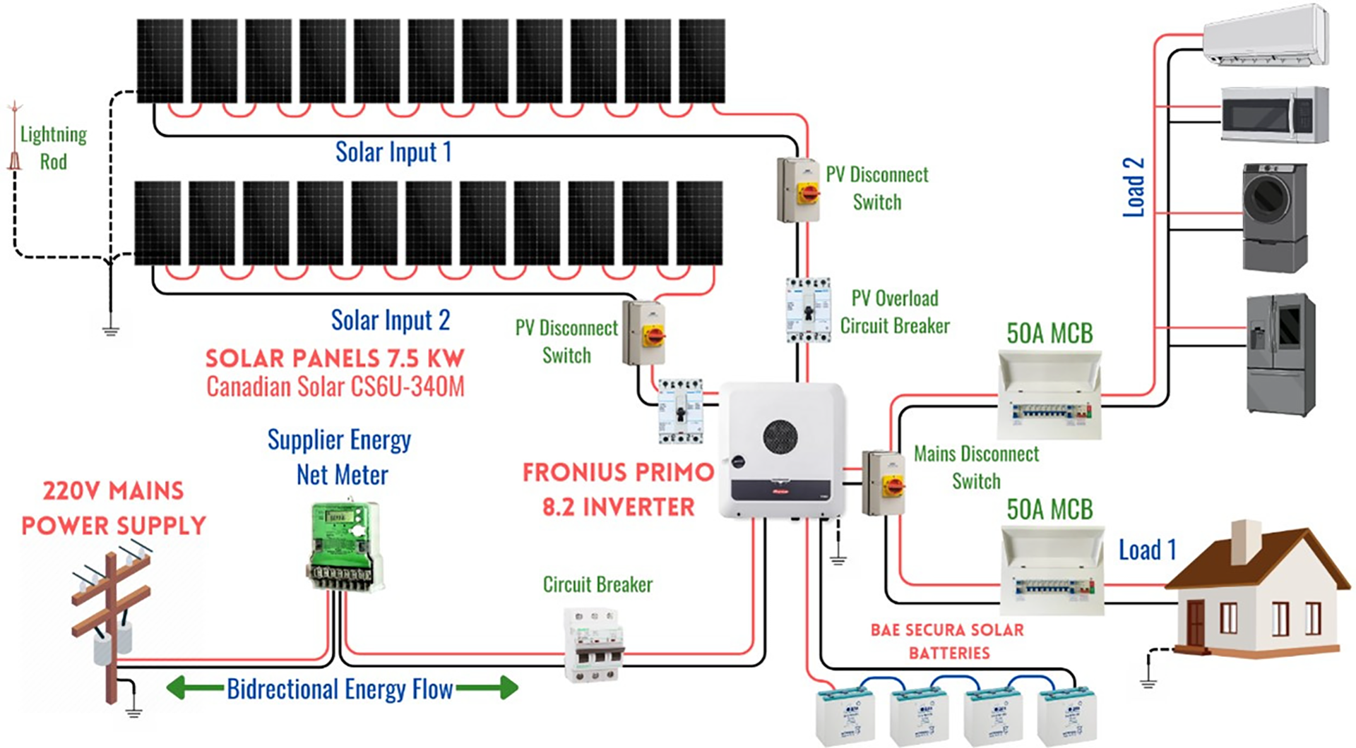 Fig. 2 illustrates the layout of the system, which integrates solar power generation, energy storage, and load management to ensure consistent and reliable energy supply. The system consists of twenty-two Canadian Solar MaxPower CS6U-340M panels arranged in two strings of eleven panels each. Each panel has a rated power output of 340 W, which results in a total solar power capacity of 7480 W, or 7.48 kW. These solar panels are connected to a Fronius Primo 8.2 inverter, which is a single-phase inverter capable of handling up to 8.2 kW of power. The inverter is equipped with two Maximum Power Point Tracking (MPPT) inputs, allowing it to optimize the power output from the panels by adjusting to varying sunlight conditions. To store the generated solar energy, the system includes four BAE Secura PVS 12 V 3 PVS 210 batteries connected in parallel. Each battery has a capacity of 211 Ah, providing a total storage capacity of 10.13 kWh. The battery bank operates at a voltage of 48 V and ensures that the system has backup power during periods of low sunlight or power outages. This setup guarantees that essential loads remain powered even when solar energy is not available.