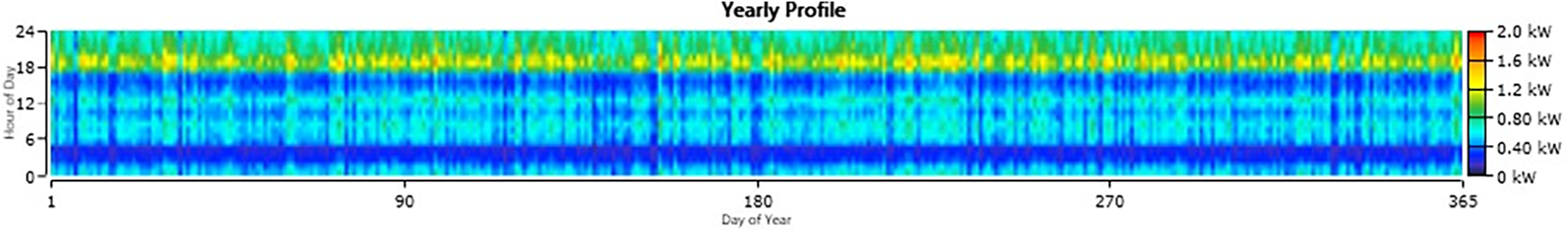 As seen in Fig. 4, the site’s load profile is key to grasping the energy demand dynamics and what they mean for the system’s design and performance. It gives a thorough breakdown of energy consumption patterns-daily, seasonal, and yearly, and these were crucial inputs for the Homer Pro simulations. An average daily demand of 16.00 kWh is reflected in the main load profile with a peak demand of 1.86 kW, underlining the energy needs of the site and it’s peak load demands. Within the load profile, we can spot seasonal shifts in energy consumption. For example, the higher energy use during the summer months is mainly due to more cooling demands, with the deferrable load making a big contribution to the overall spike. Meanwhile, the winter months show a decrease in energy use, which reduces the load on the system.