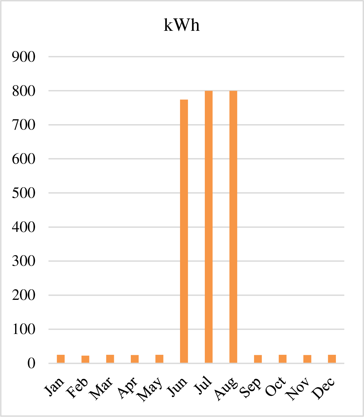 Every year, the energy produced by the sun goes through ups and downs due to the changing intensity of sunlight throughout the seasons. It shows how solar energy production spikes in the summertime and falls in the winter due to the days being shorter and the sunlight weaker. But when it’s summer, the system is in its prime, making enough power not just for everyday needs but even enough to stash some away in batteries. Winter tells a different story: energy production dips and we need to lean on the grid a bit to keep the site powered. The rated capacity of the Solar Panels is 7.5 kW but as we all know that the efficiency of panels is around 20 % the maximum output, we can get from the PV panels is 5.95 kW. Total solar output we got in a year is 10,540 kWh/yr. The good thing is, this keeps interruptions at bay and ensures our energy needs are taken care of, even when sunlight is scarce. If you look at how solar output stacks up in spring and fall–the transition seasons, you’ll see a stable, moderate production of energy can be seen in Fig. 5.
