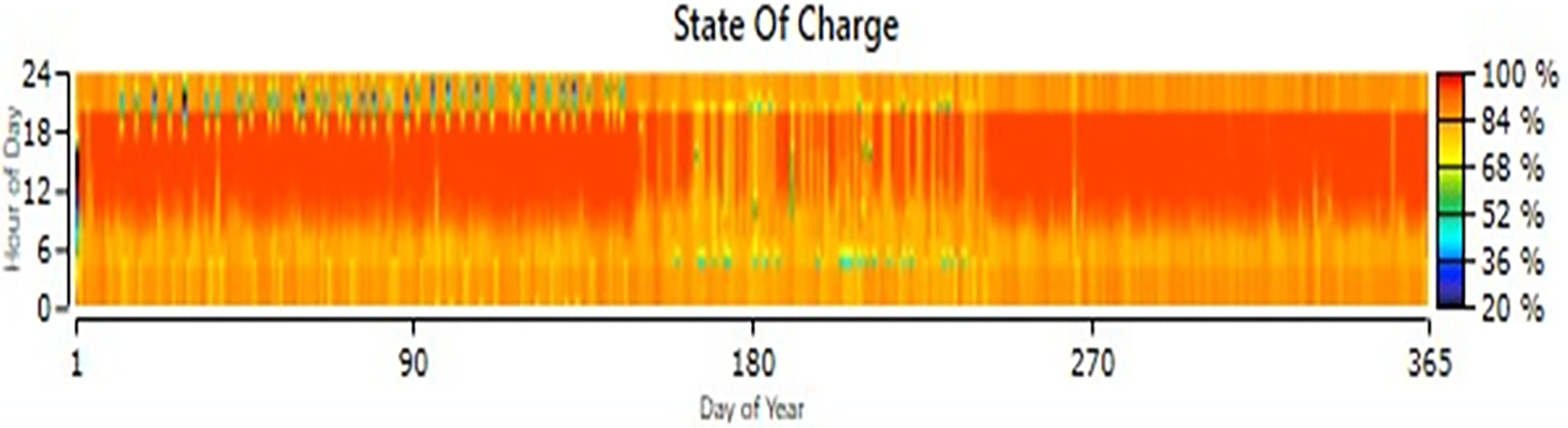 To assess the performance and design optimization of the solar energy system, simulations were conducted using Homer Pro, a strong tool widely used for modeling renewable energy systems. The simulation conditions included the integration of solar panels, battery storage, and grid connectivity for the location specified in Section 2.1. The study examined the system’s yearly and seasonal profiles, grid interactions, and renewable energy penetration measurements. Key input conditions included into the Homer Pro simulation included a daily electrical load of 16.00 kWh, a peak load of 1.86 kW, and the inclusion of Canadian Solar Max Power CS6U-340M panels paired with BAE 12 V 3 PVS batteries for storage. The tool simulated renewable energy generation, storage capacity, grid dependency and deferrable load though considering geographic and climatic conditions, as described earlier. The simulation Included load-specific details to reflect the actual usage patterns, ensuring the results Matched with real-world scenarios. The results include renewable penetration, power output, grid sales, and the state of charge for batteries. Instantaneous renewable hours and grid interactions were also monitored, with renewable penetration reaching values between 70% and 90% for most hours.