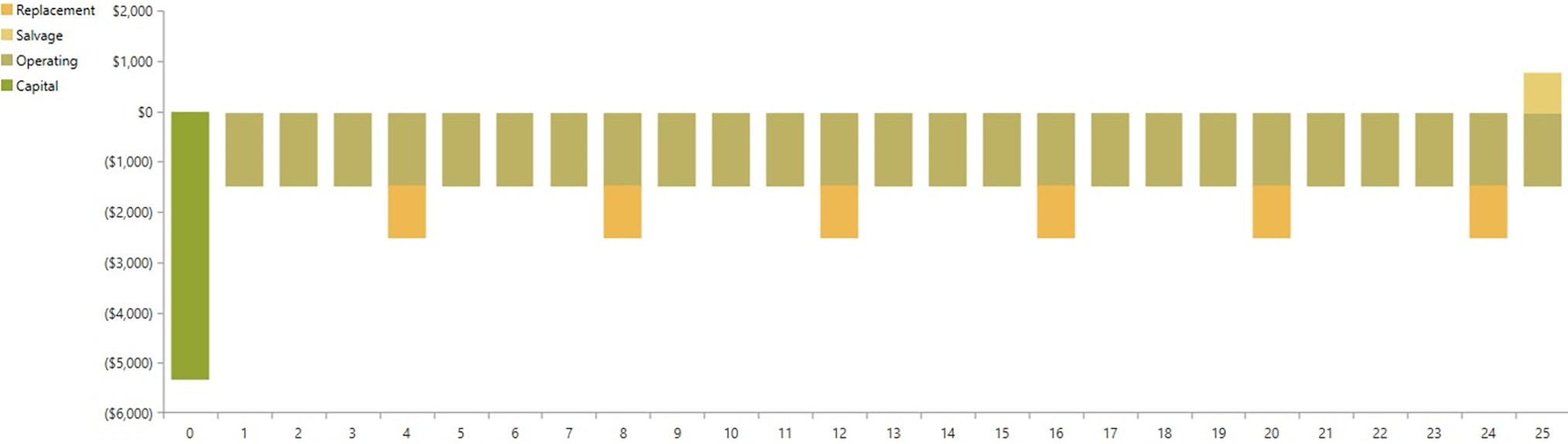 The total budget for this project is essentially governed by three key variables: first up, the initial cash investment, secondly, the periodic replacements of certain equipment parts, and finally, the cost of upkeep and operational services. The first big chunk of our budget will go into buying and setting up solar panels, battery storage units, and inverters. From this initial outlay, the solar panels are the big-ticket item, swallowing up about 60% of the cash pile. Batteries and the inverter will each want a slice too, but at a more modest 30% and 10% apiece. These ratios keep in step with the broader industry trends where solar panels and batteries are the main culprits in the initial outlay. As we move further along in time, there will be parts of the system asking for a refresh due to the usual wear and tear. Battery Storage systems-always working hard-will likely be needing a swap every four years depending on the rigors of their usage. The inverters life considered is 25 Years and it doesn’t require replacement if general Preventive maintenance is carried out. Fig. 11 throws some light onto how these costs are spread out over the system’s life journey, underlining how they feed into the long-term financial game plan. On to everyday inspections, those solar panel clean-ups, and the occasional patch-up jobs-those O&M or operations and maintenance costs. These everyday spends are more the quiet whisper in the crowd, contributing less than 5% of the overall lifecycle cost. Thanks to the robustness of today’s solar panels and the improved efficiencies of modern inverters, these costs aren’t too steep, making the financial aspects of the system all the more appealing.
