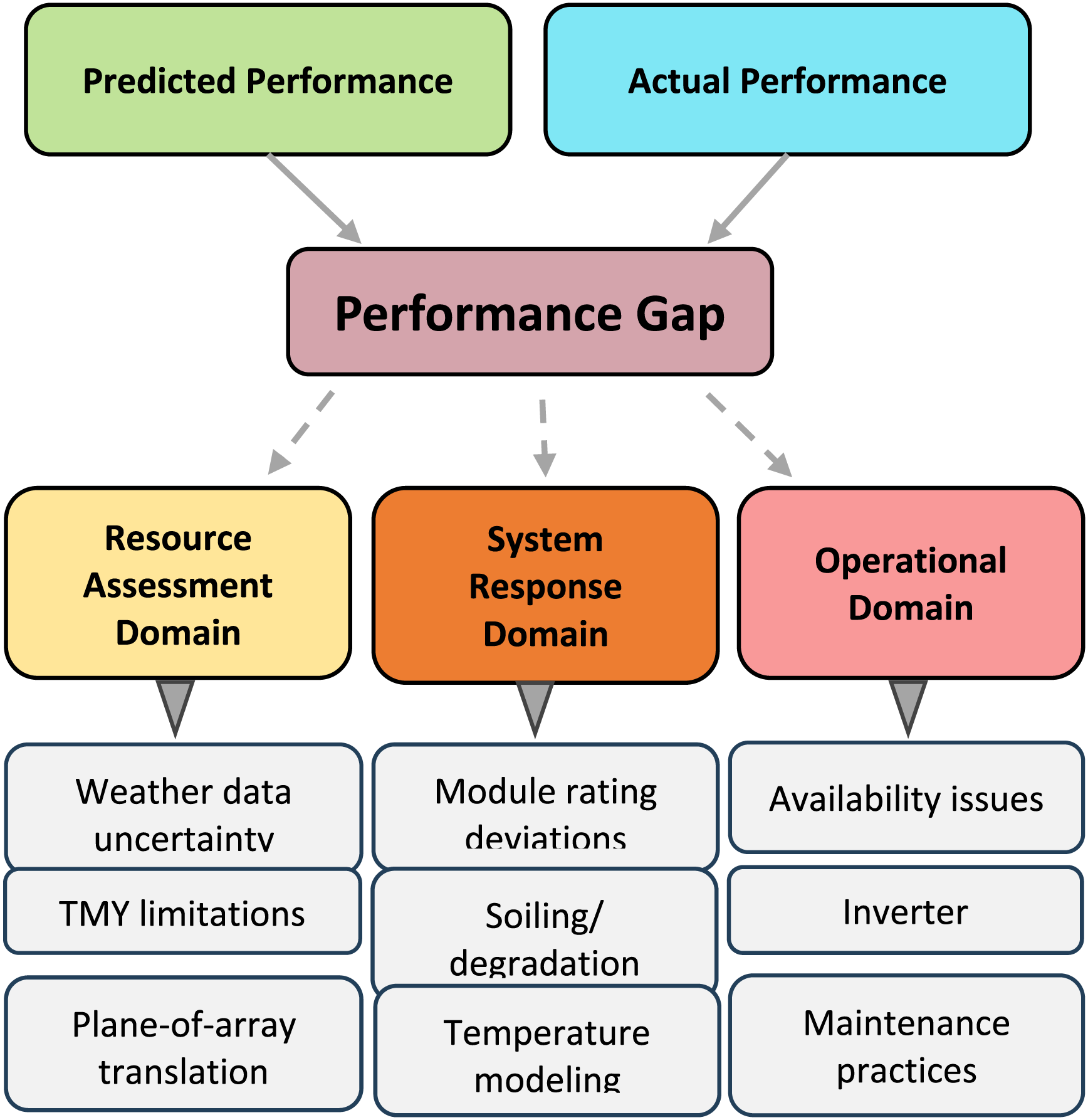 The IEA Report [8] on PV system yield predictions established standardized metrics for performance gap assessment, recommending the decomposition of overall deviation into specific categories: resource assessment error, loss factor estimation error, and operational deviation. This structured approach enables more systematic identification of error sources and facilitates targeted improvement of modeling methodologies. The conceptual framework for performance gap analysis is illustrated in Fig. 1, which shows the hierarchical breakdown of factors contributing to discrepancies between predicted and actual performance across three primary domains.