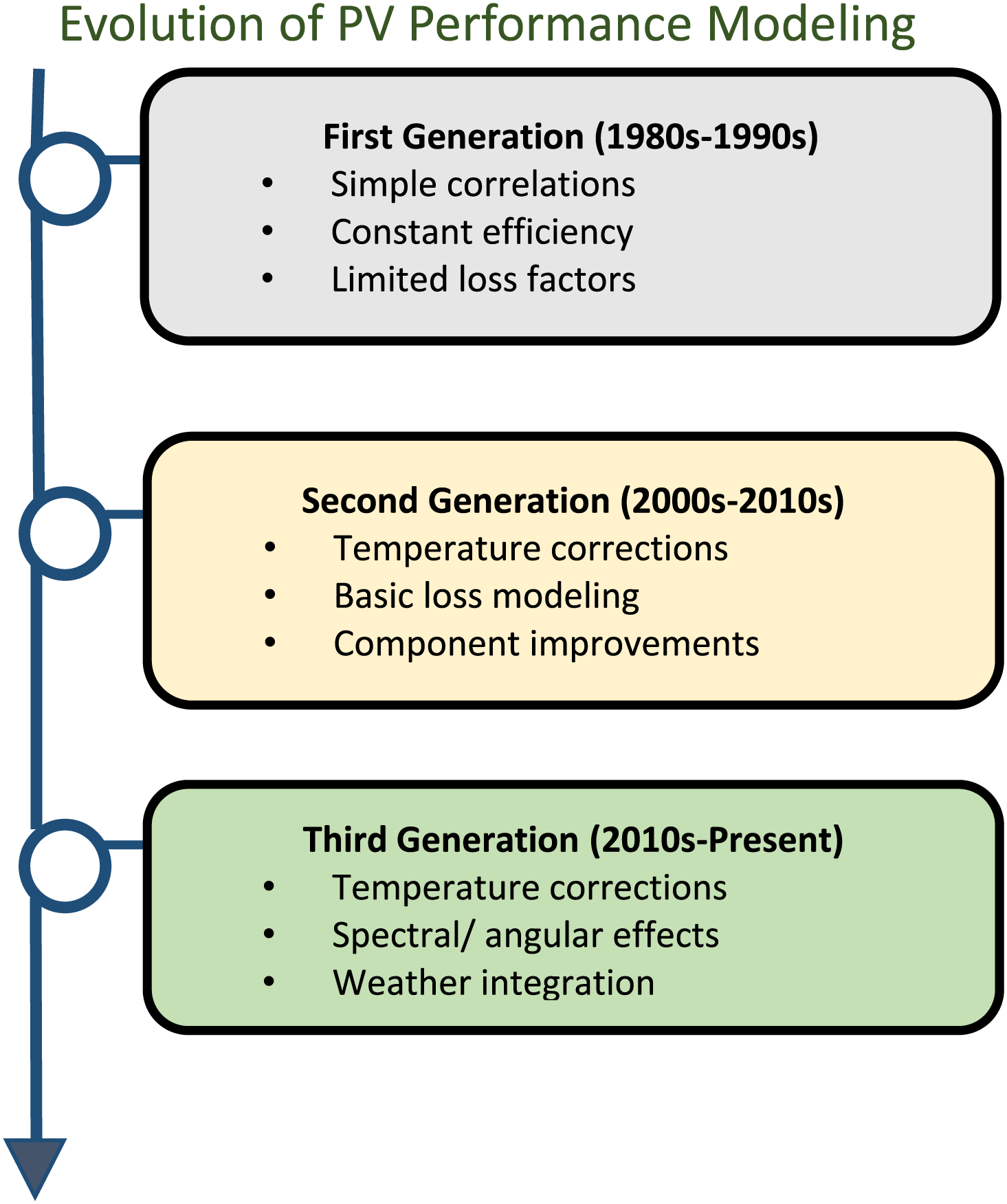 Despite these advances, the literature reveals a persistent need for more systematic, integrated approaches to performance gap reconciliation. While many studies have identified specific contributing factors or proposed corrections for individual aspects of performance modeling, comprehensive frameworks that address multiple sources of discrepancy within a coherent methodology remain limited. This gap in the literature provides the foundation for the present study’s contribution in developing a structured reconciliation framework. Fig. 2 demonstrates the evolution of PV performance modeling approaches over three generations, showing the progression from simple correlations to comprehensive analytical frameworks currently used in industry practice.