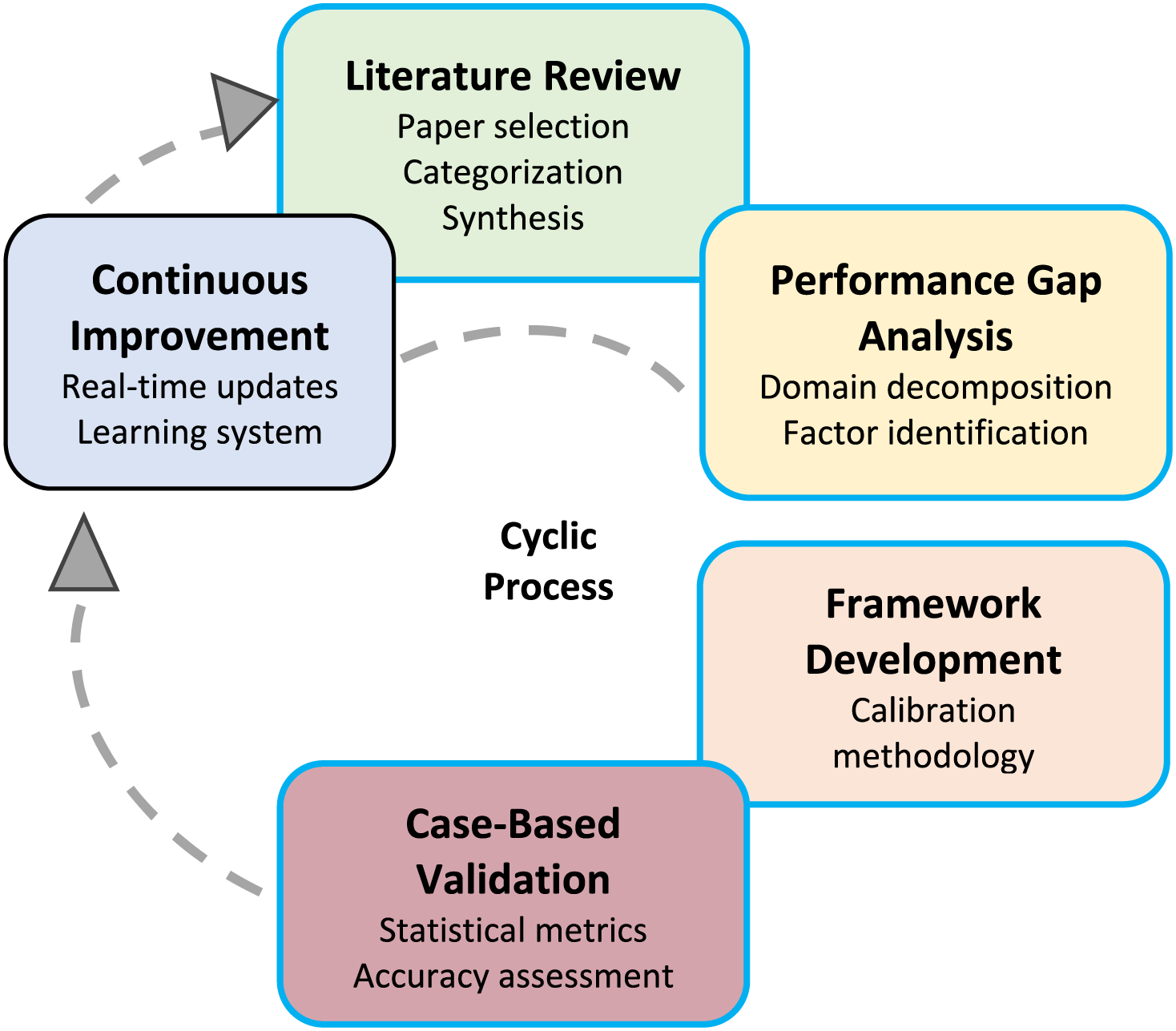 The development of our reconciliation framework follows a modular structure that addresses each performance gap domain sequentially while preserving the interdependencies between domains. The framework integrates three key methodological approaches: