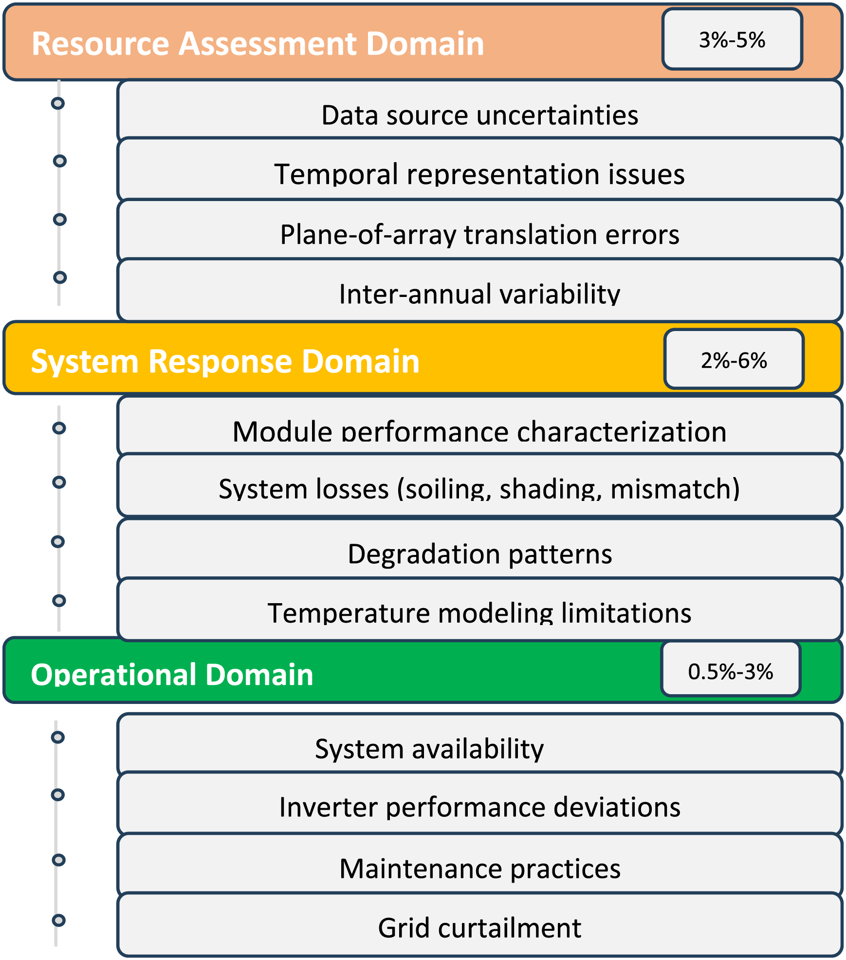 1. Resource Assessment Domain: Factors related to the characterization and prediction of solar resource, including measurement uncertainties, spatial interpolation errors, temporal resolution limitations, and stochastic variability.