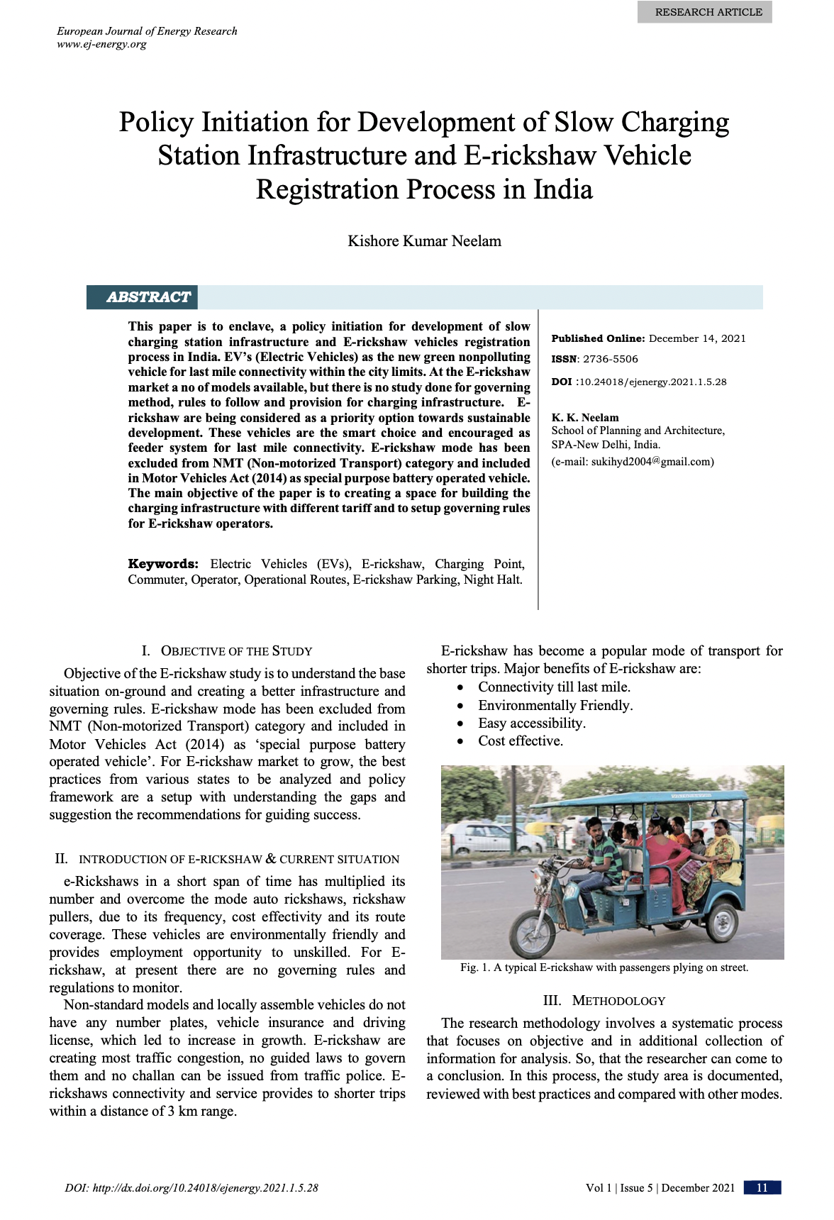 Policy Initiation for Development of Slow Charging Station Infrastructure and E-rickshaw Vehicle Registration Process in India